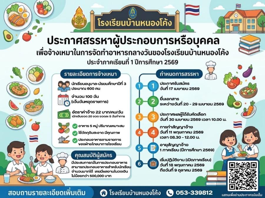 ประกาศโรงเรียนบ้านหนองโค้ง เรื่อง สรรหาผู้ประกอบการหรือบุคคลเพื่อจ้างเหมาในการจัดทำอาหารกลางวันโรงเร..