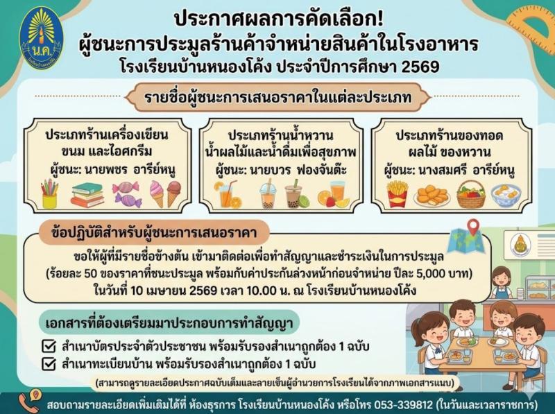 ประกาศโรงเรียนบ้านหนองโค้ง เรื่อง ประกาศผลการคัดเลือก ผู้ชนะการประมูลร้านค้าจำหน่ายสินค้าในโรงอาหาร..