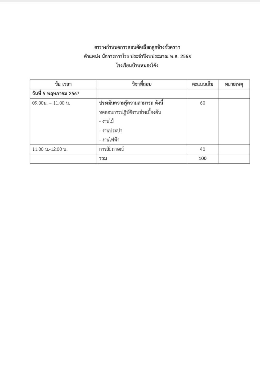 โดยให้ผู้ที่มีรายชื่อเข้ารับการทดสอบการปฏิบัติงาน ในวันที่ 5 พฤษภาคม 2568 เวลา 09.00 น.เป็นต้นไป ณ โรงเรียนบ้านหนองโค้ง ถ้าไม่มาเข้าสอบจะถือว่าสละสิทธิ์