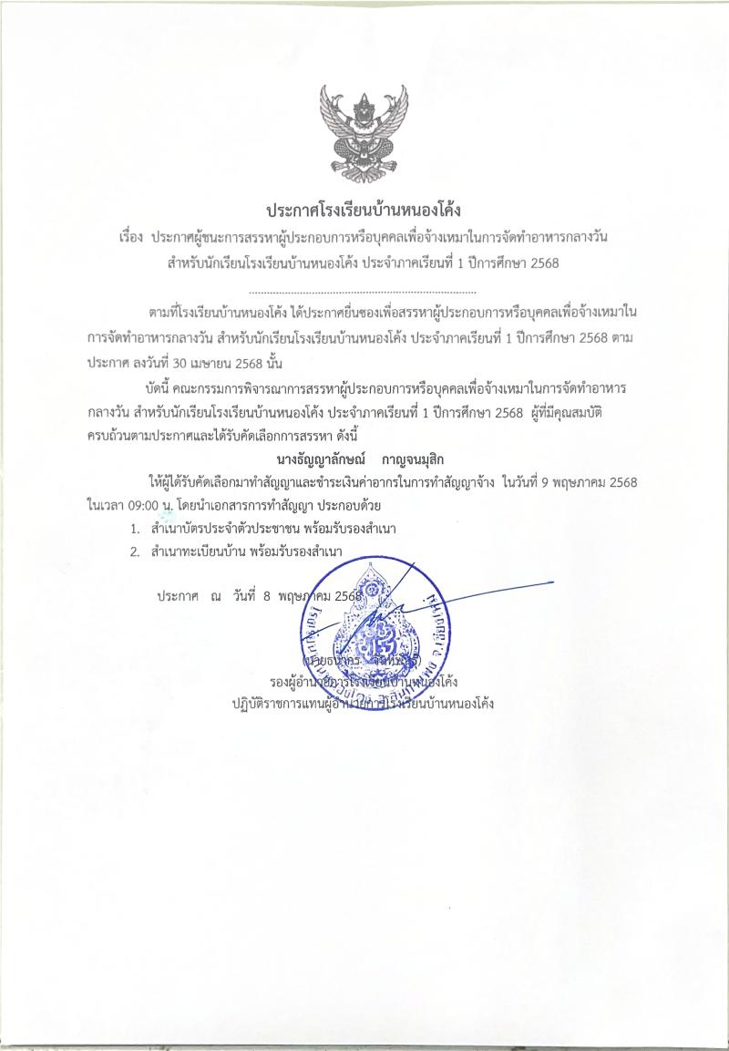 ประกาศผู้ชนะการสรรหาผู้ประกอบการหรือบุคคลเพื่อจ้างเหมาในการจัดทำอาหารกลางวันนักเรียน ประจำภาคเรียนที..