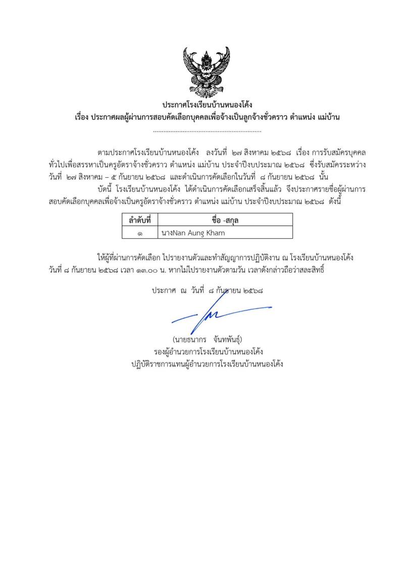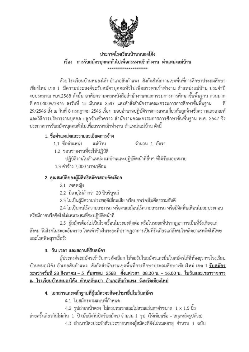 ประกาศรับสมัครบุคคลทั่วไป ตำแหน่งแม่บ้าน 1 อัตรา ตั้งแต่วันนี้ - 5 กันยายน 2568 ณ โรงเรียนบ้านหนองโค..