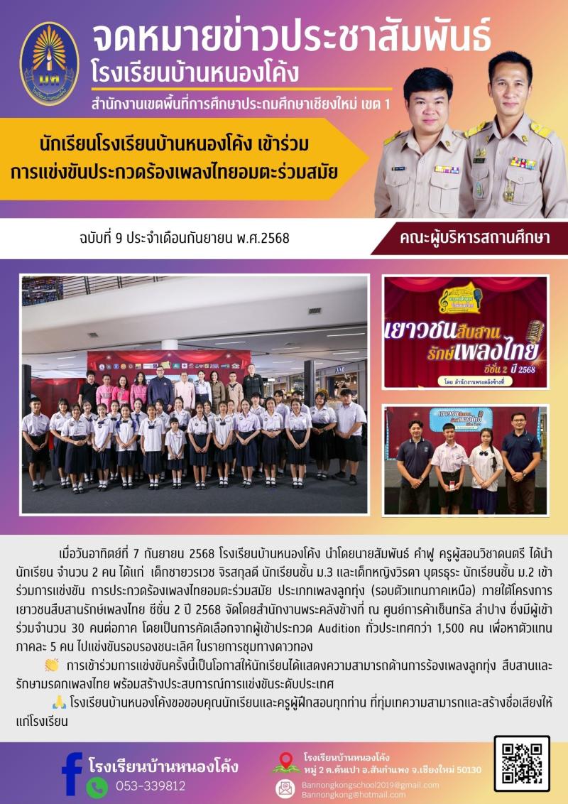 นักเรียนโรงเรียนบ้านหนองโค้ง เข้าร่วมการแข่งขันประกวดร้องเพลงไทยอมตะร่วมสมัย