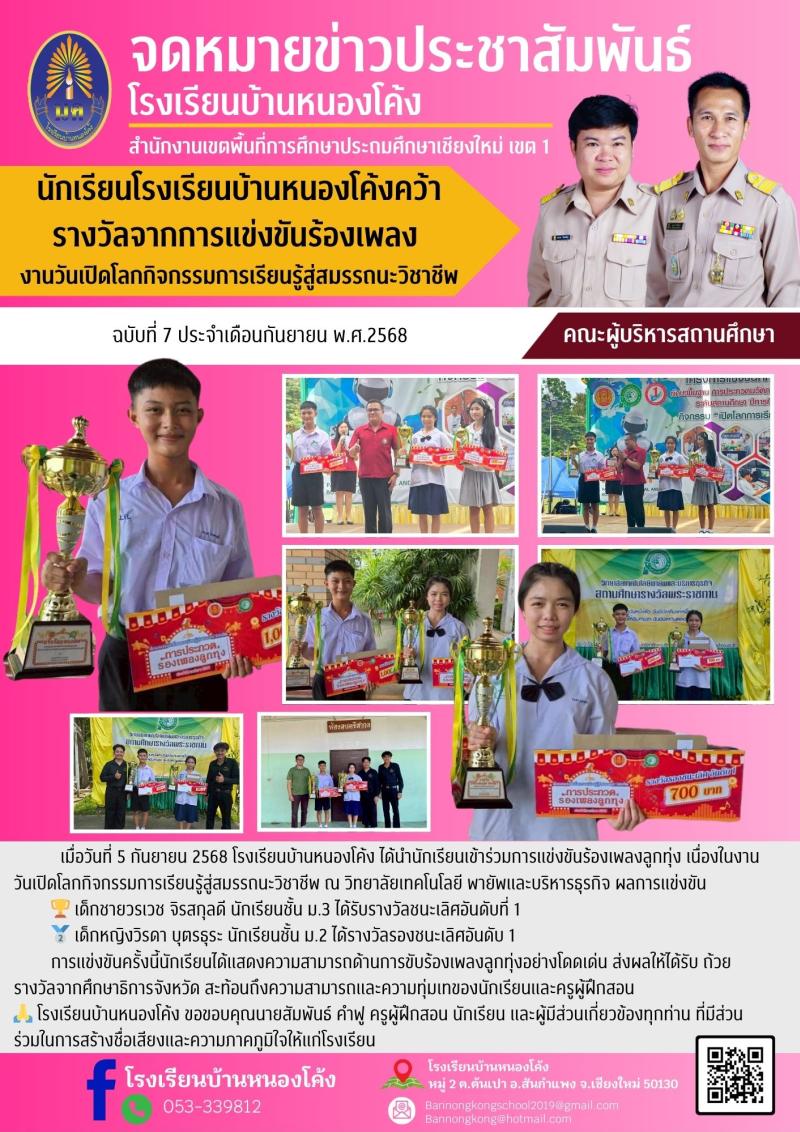 นักเรียนโรงเรียนบ้านหนองโค้งคว้ารางวัลจากการแข่งขันร้องเพลง งานวันเปิดโลกกิจกรรมการเรียนรู้สู่สมรรถ..