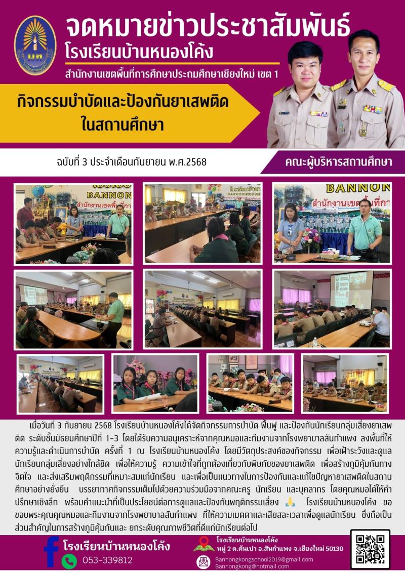 โรงเรียนบ้านหนองโค้ง ดำเนินกิจกรรมธรรมะชำระใจ โดยมีการสวดมนต์ประจำสัปดาห์ ทุกวันศุกร์