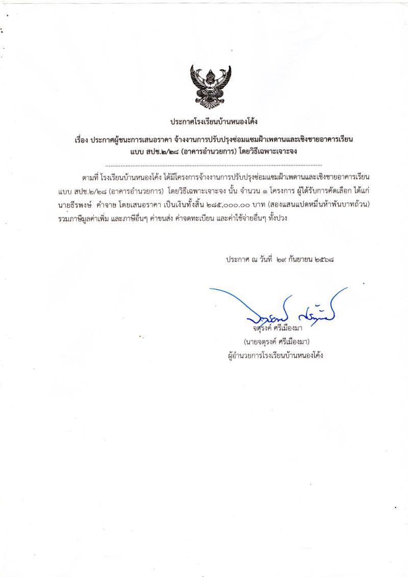 ประกาศผู้ชนะการเสนอราคา จ้างเหมาบริการปรับปรุงซ่อมแซมฝ้าเพดานและเชิงชายอาคารเรียน