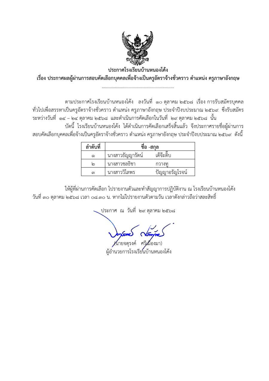 ประกาศรายชื่อผู้ผ่านการคัดเลือกเป็นครูอัตราจ้างชั่วคราว ตำแหน่งครูผู้สอนวิชาภาษาอังกฤษ