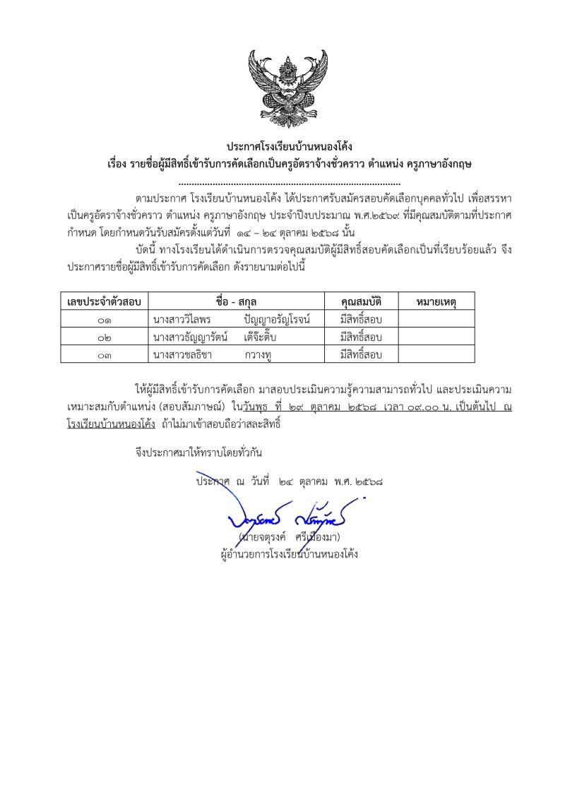 ประกาศรายชื่อผู้มีสิทธิ์เข้ารับการคัดเลือกเป็นครูอัตราจ้างชั่วคราว ตำแหน่งครูผู้สอนวิชาภาษาอังกฤษ