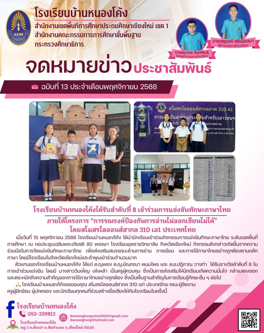 โรงเรียนบ้านหนองโค้งได้รับลำดับที่ 8 เข้าร่วมการแข่งขันทักษะภาษาไทย ภายใต้โครงการ “การรณรงค์ป้องกันก..