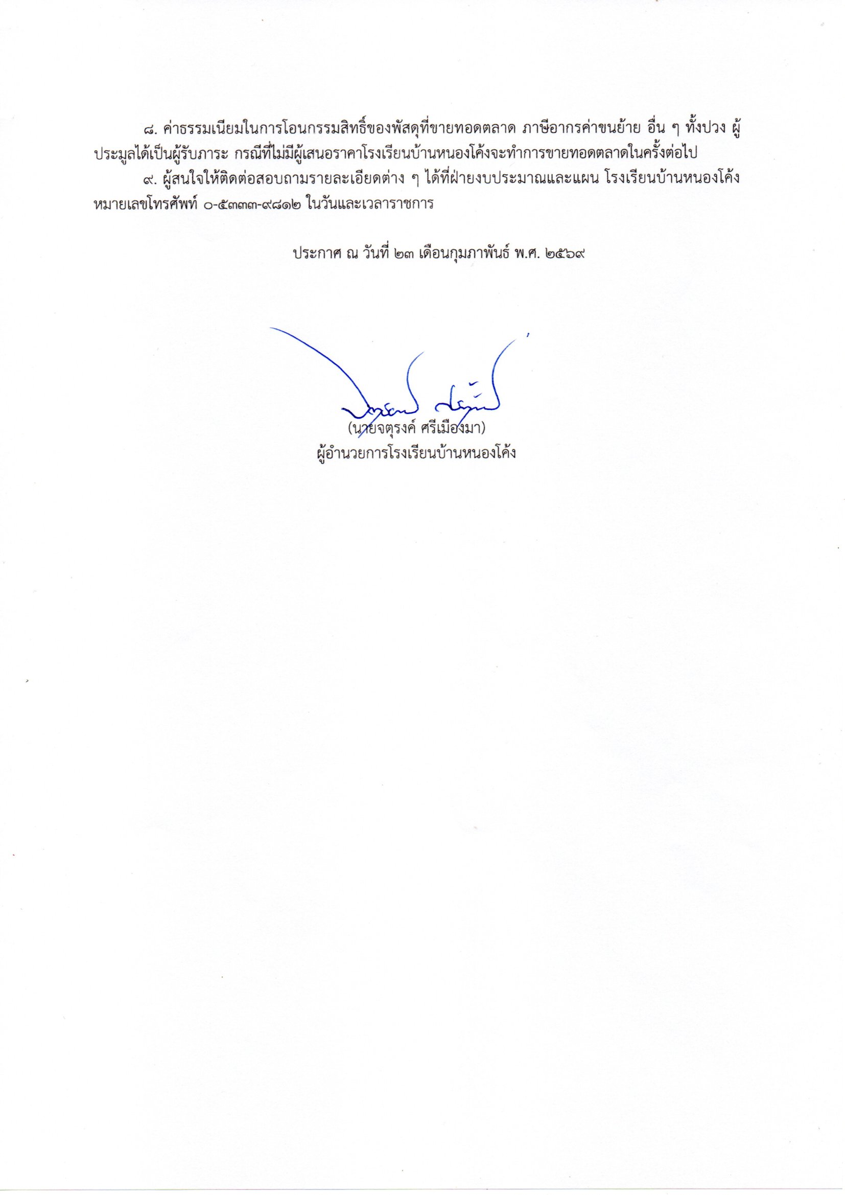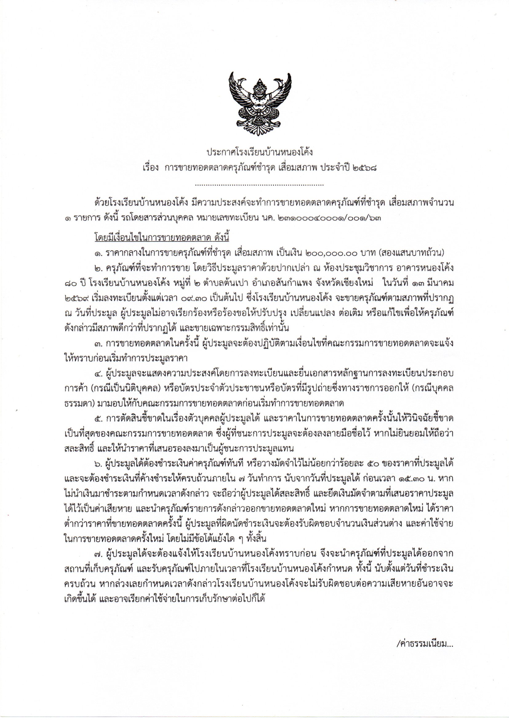 โรงเรียนบ้านหนองโค้งประกาศ ขายทอดตลาดครุภัณฑ์ที่ชำรุด เสื่อมสภาพ จำนวน 1 รายการ (รถโดยสารส่วนบุคคล) ประจำปี 2568 โดยมีสาระสำคัญดังนี้